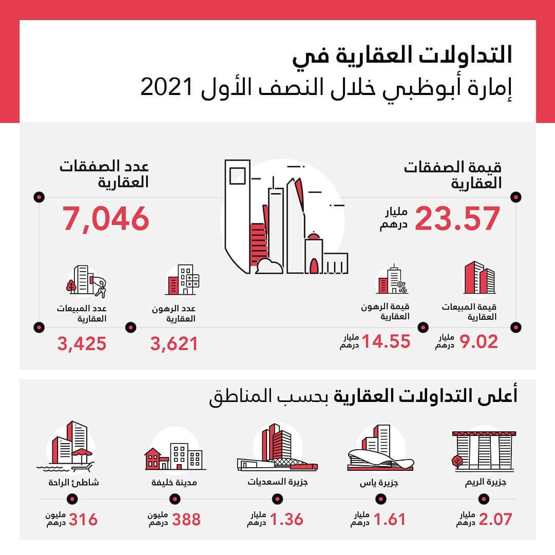 أعلنت دائرة البلديات والنقل اليوم عن نتائج النصف الأول من العام 2021 حيث سجلت إجمالي قيمة التداولات العقارية في إمارة أبوظبي 23.57مليار درهم تم تحقيقها من خلال 7046 معاملة شملت تداولات ورهونات الأراضي والمباني والوحدات العقارية بمختلف أنواعها. وأظهرت نتائج مؤشرات التداولات العقارية الصادرة عن دائرة البلديات والنقل تسجيل القطاع العقاري بالإمارة 3425 صفقة بيع لعقارات بما قيمته 9.02 مليار درهم، و3621 معاملة رهن عقاري بقيمة 14.55 مليار درهم.